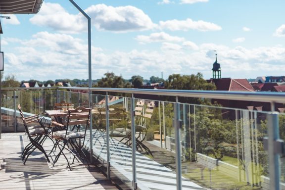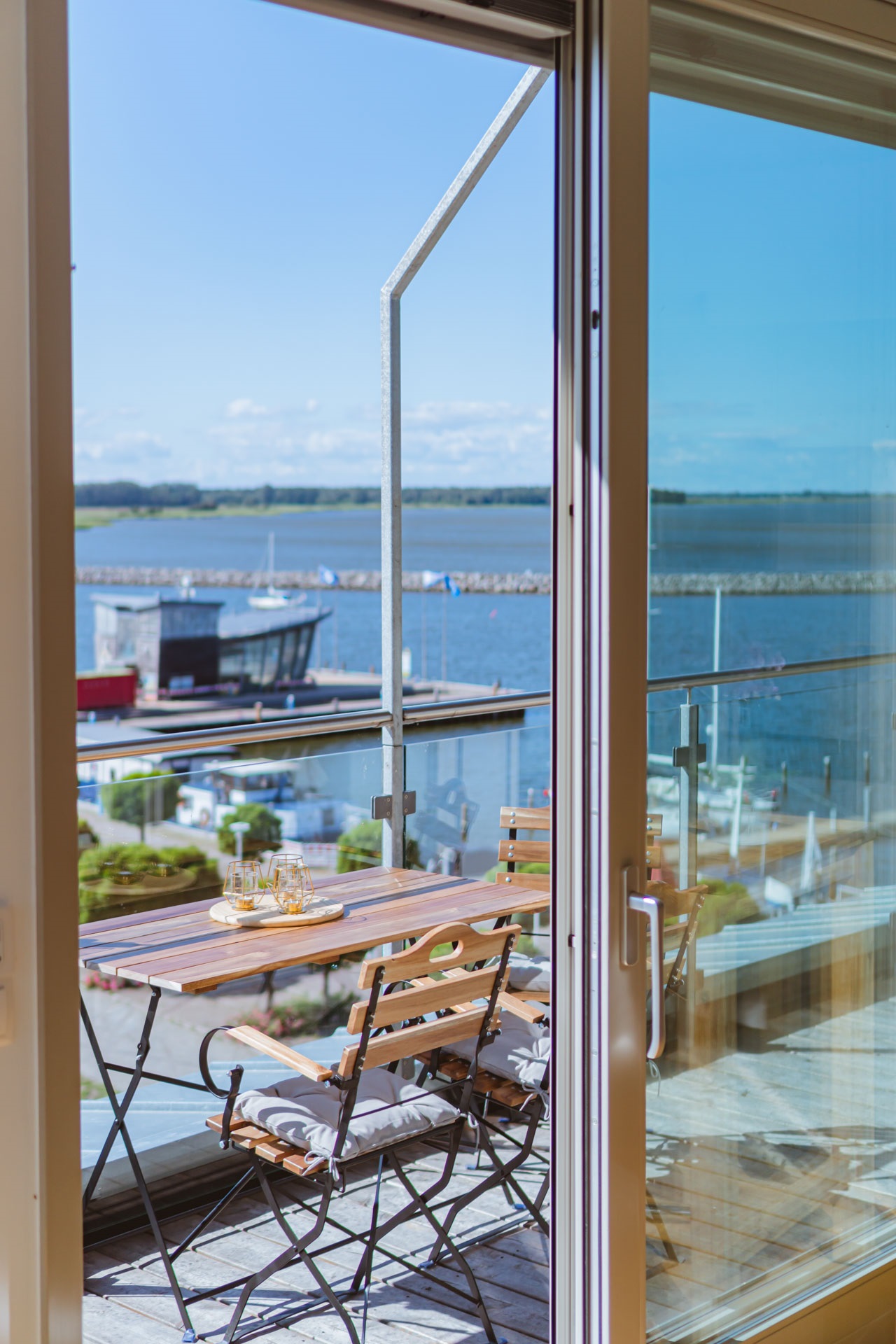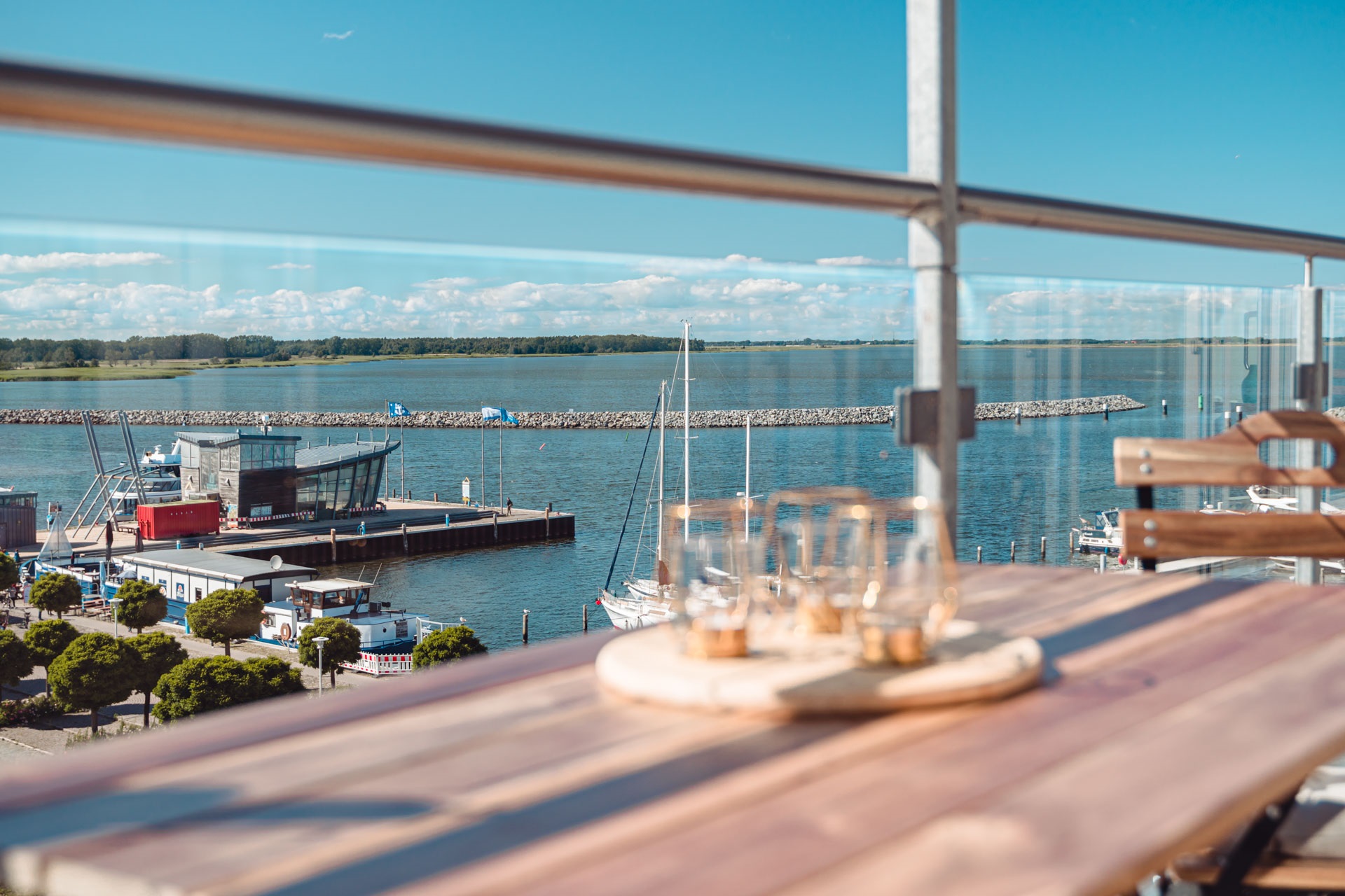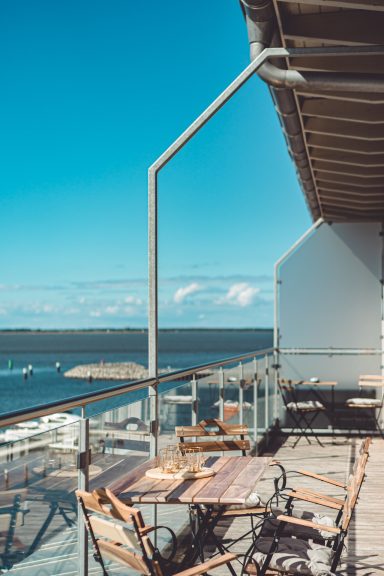 Die großzügige Terrasse bietet Sitzgelegenheiten und einen direkten Blick auf den Hafen. Hier lässt sich der Tag entspannt beginnen oder ausklingen – mit frischer Luft, Weite und maritimem Flair.